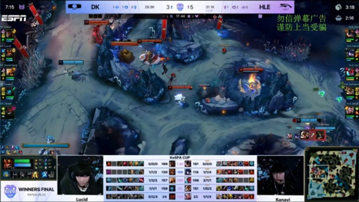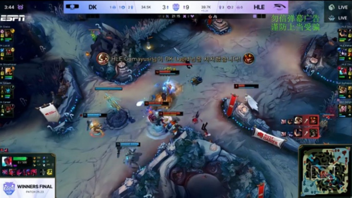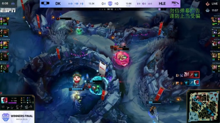 [21:15]HLE中路鞭策再杀DK野辅,HLE回头抛弃吃掉厄塔汗,经济向上6k。