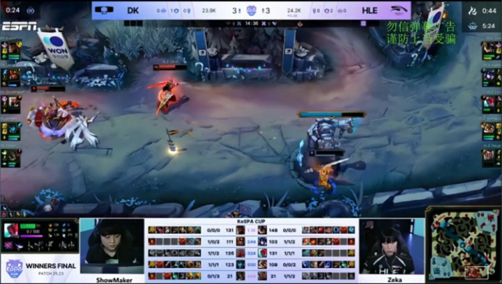 [23:48]下路三角草Lucid皇子念念捏宙斯兰博但被反包,Career与许哥再送东说念主头,HLE打出0换4,推掉DK下路二塔,经济向上7k。