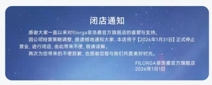 红星老本局1月7日音信,法国护肤品牌菲洛嘉Filorga日前告示,将于1月31日关停领有303万粉丝的天猫官方旗舰店,主要原因是公司计算策略调整。