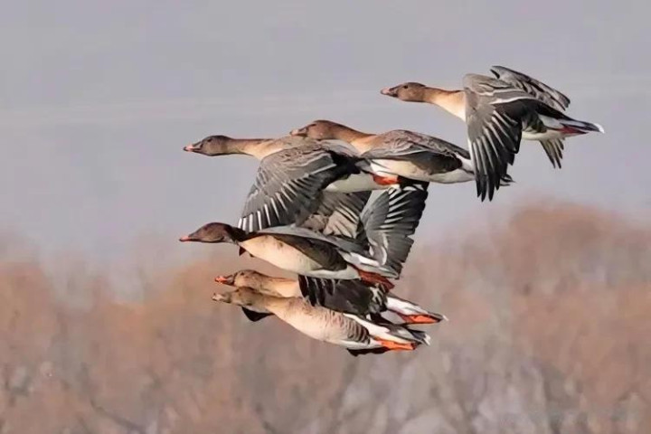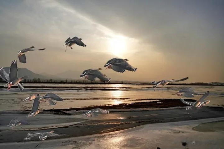 夕阳西下,给湿地镀上一层暖金。徒然,一群豆雁受了搅扰般都都惊起,翅膀有劲地扇动,在暮色中划出灵动的曲线,身姿壮健又带着几分仓皇,冲破了湿地薄暮的静谧,朝着远方飞去。