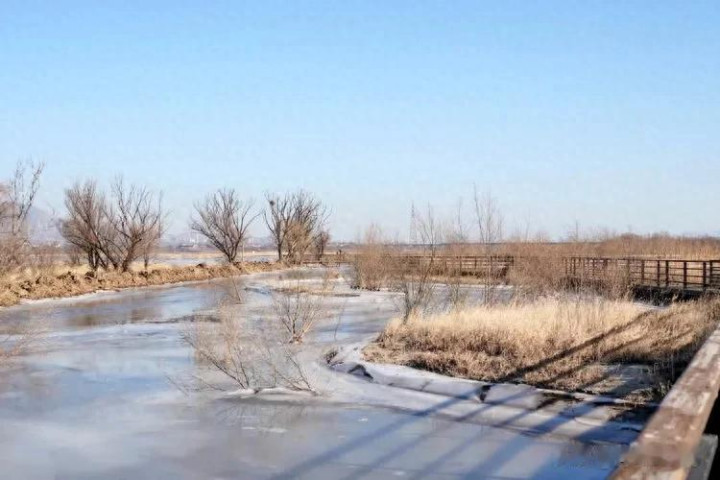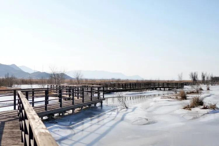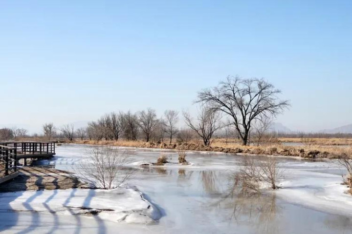木栈说念沿着湿地延长,栈说念的木板方法深千里,与周围的冰雪、枯木变成较着对比。此刻,栈说念上莫得行东说念主,惟有阳光投下的影子,长长地、静静地铺在上头,像是时光留住的陈迹。