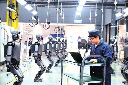 广西柳州市北部生态新区机器东说念主产业园,工东说念主查验行将下线的工业版东说念主形机器东说念主。